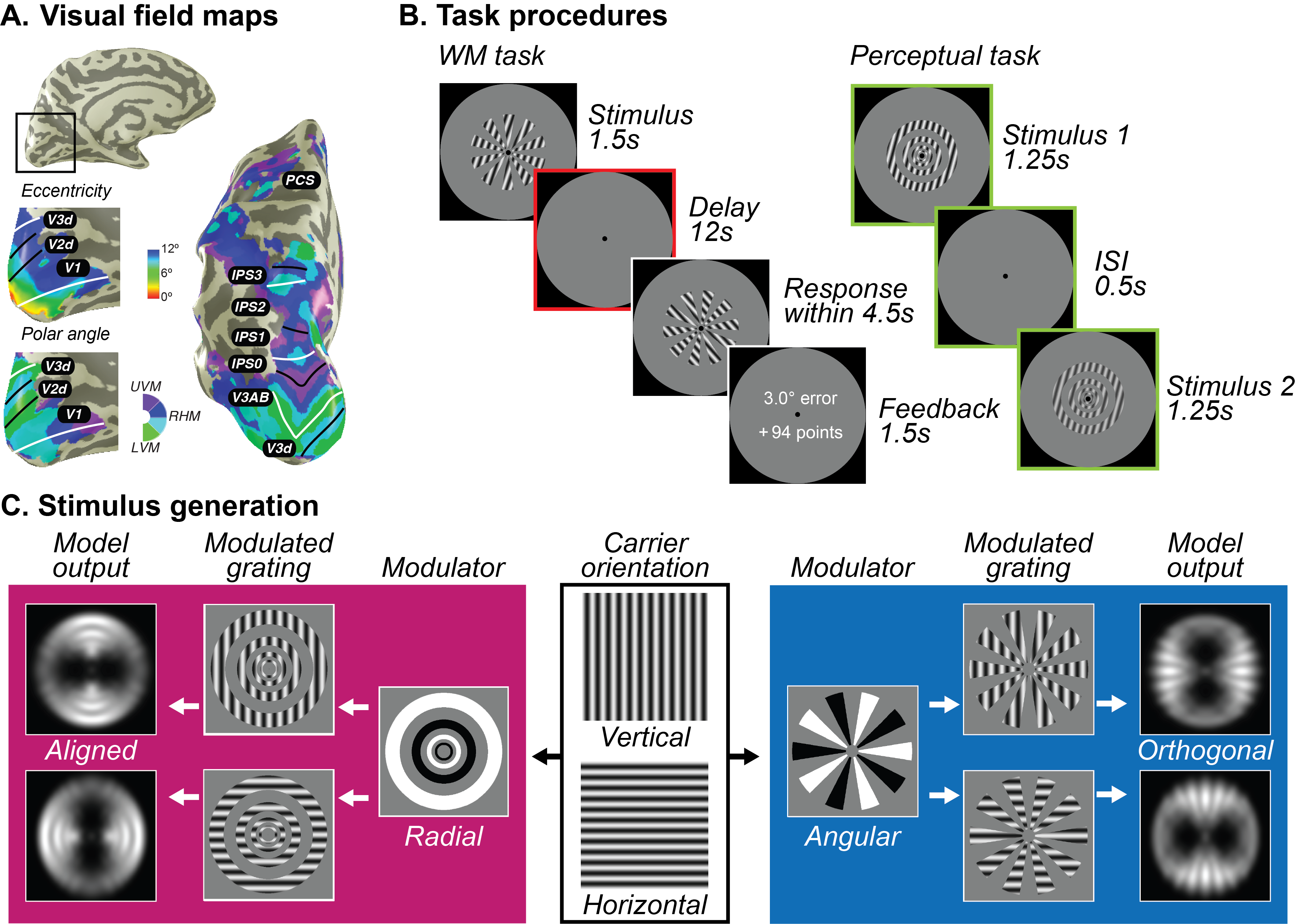 Next, to reveal the representational formats of WM, we constructed the spatial profile of neural activity within visual field maps. Regardless of aperture biases, WM representations of both modulated gratings were recoded into a single-oriented line that matches the remembered orientation but not the aperture bias.