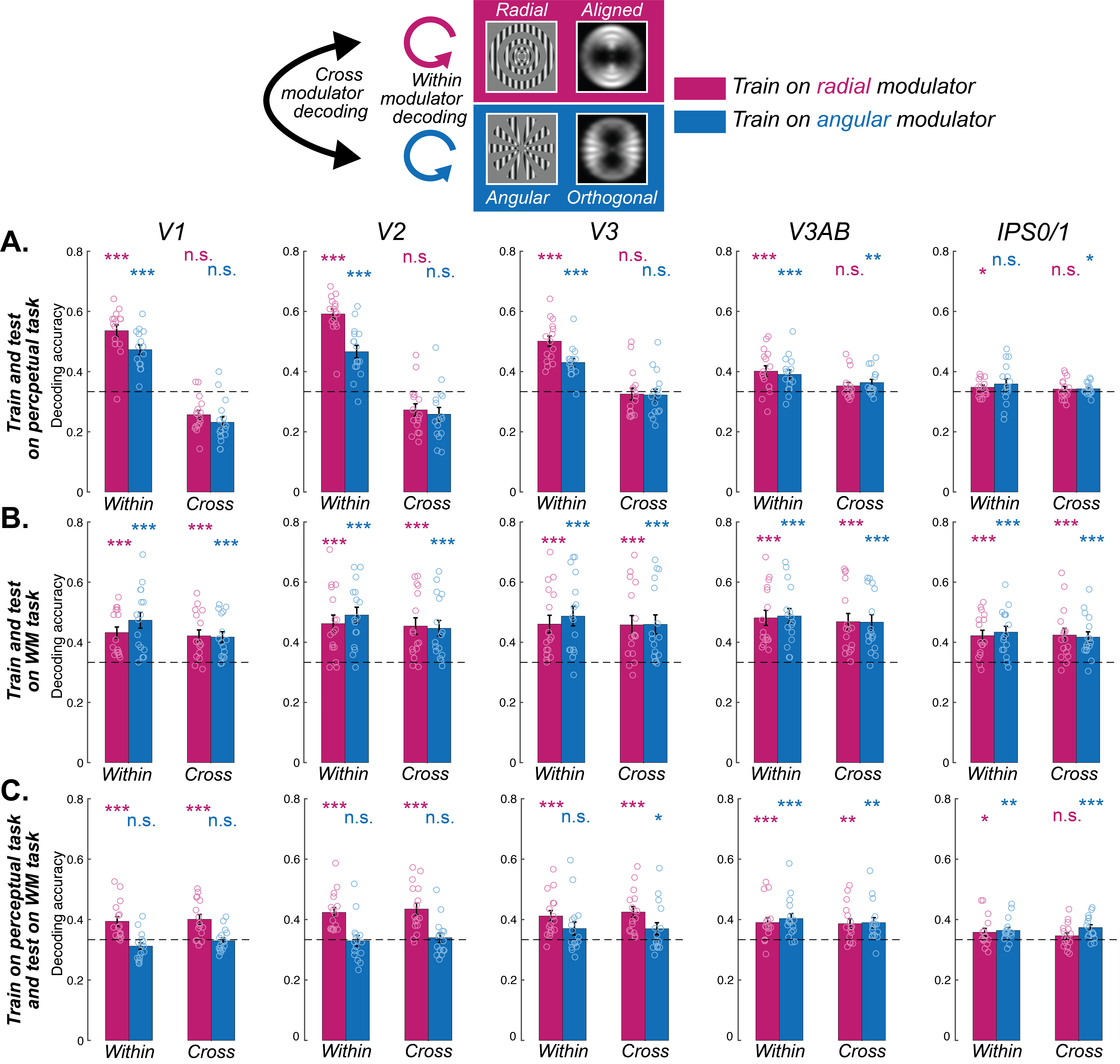 Decoding results showed aperture bias during the perceptual task, where orientations can be decoded only within the same kind of modulated gratings but can’t be generalized to different types in early visual cortex (V1-V3). However, both within and cross-modulator decoding is successful during the WM task. Moreover, we found that classifiers trained during perception can be used to decode orientation information in WM, but only when the aperture bias is aligned with the orientation of the grating (i.e., radial modulator).